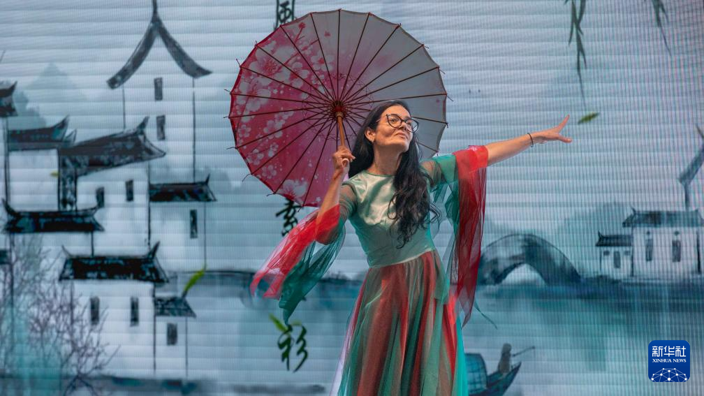 4月16日,在塞尔维亚尼什举行的中文大赛上,选手表演舞蹈。