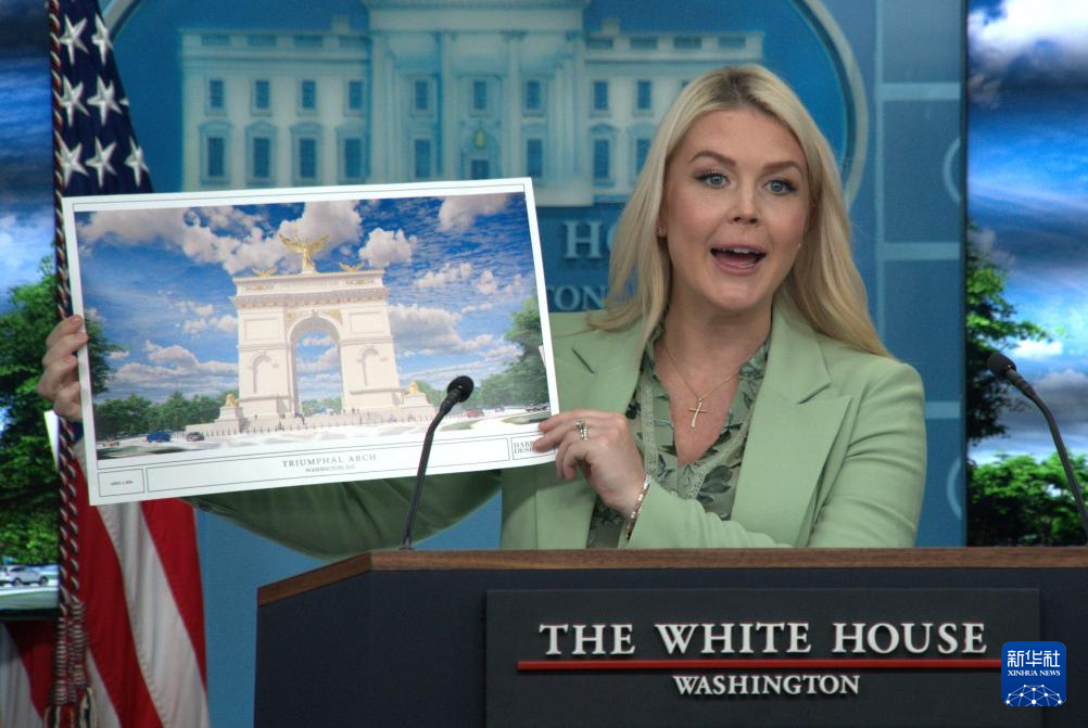 4月15日,在美国首都华盛顿白宫,白宫新闻秘书莱维特在记者会上展示拟建“凯旋门”的效果图。