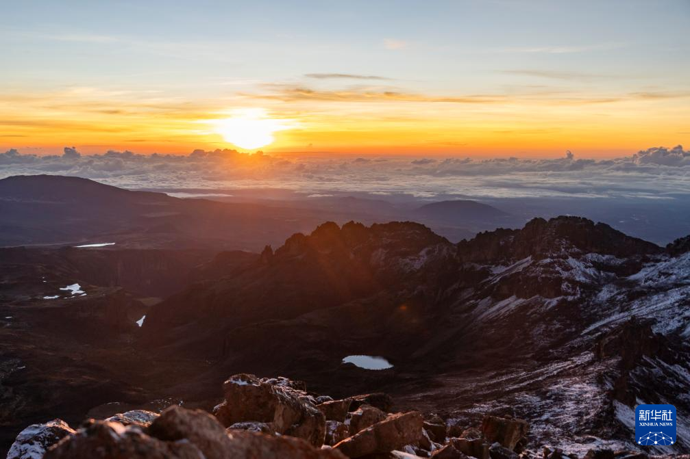 这是4月12日在肯尼亚山国家公园莱纳纳峰峰顶拍摄的日出景观。