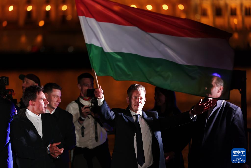 4月12日,在匈牙利首都布达佩斯,匈牙利蒂萨党领导人毛焦尔·彼得(中)在胜选晚会上挥舞匈牙利国旗。