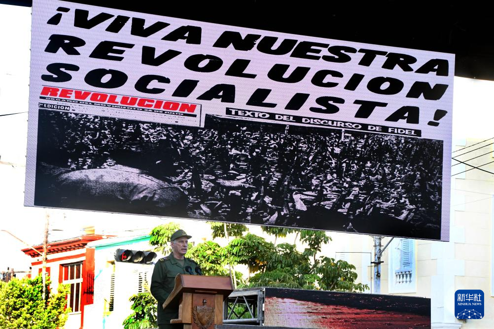 4月16日,在古巴首都哈瓦那,古共中央第一书记、古巴国家主席迪亚斯-卡内尔在纪念集会上发表讲话。