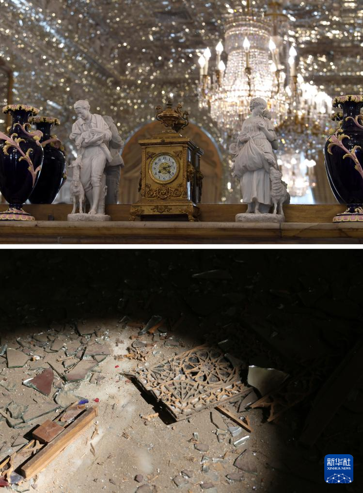拼版照片:上图为2023年8月27日在伊朗首都德黑兰拍摄的古莱斯坦宫(新华社记者沙达提摄),下图为2026年3月3日在德黑兰拍摄的在空袭中受损的古莱斯坦宫(新华社发)。古莱斯坦宫又称“玫瑰宫”,是伊朗重要的王宫建筑群之一,2013年被联合国教科文组织列入世界遗产名录。自今年2月28日美以伊冲突爆发以来,古莱斯坦宫遭到直接打击并受到严重结构性破坏。