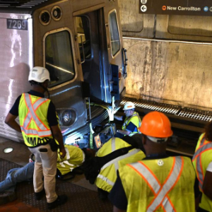 4月22日,在美国华盛顿的地铁中心站,华盛顿都会区交通局工作人员处置发生相撞事故的地铁列车。