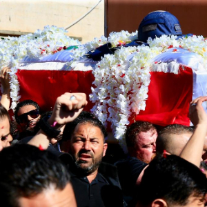4月23日,在黎巴嫩南部拜萨里耶镇,人们参加遇难的黎巴嫩女记者阿玛勒·哈利勒的葬礼。
