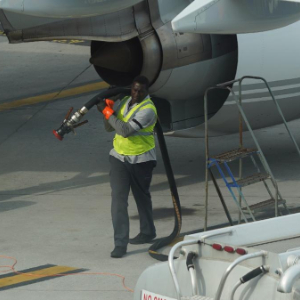 4月23日,在美国纽约拉瓜迪亚机场,工作人员为一架飞机加油。
