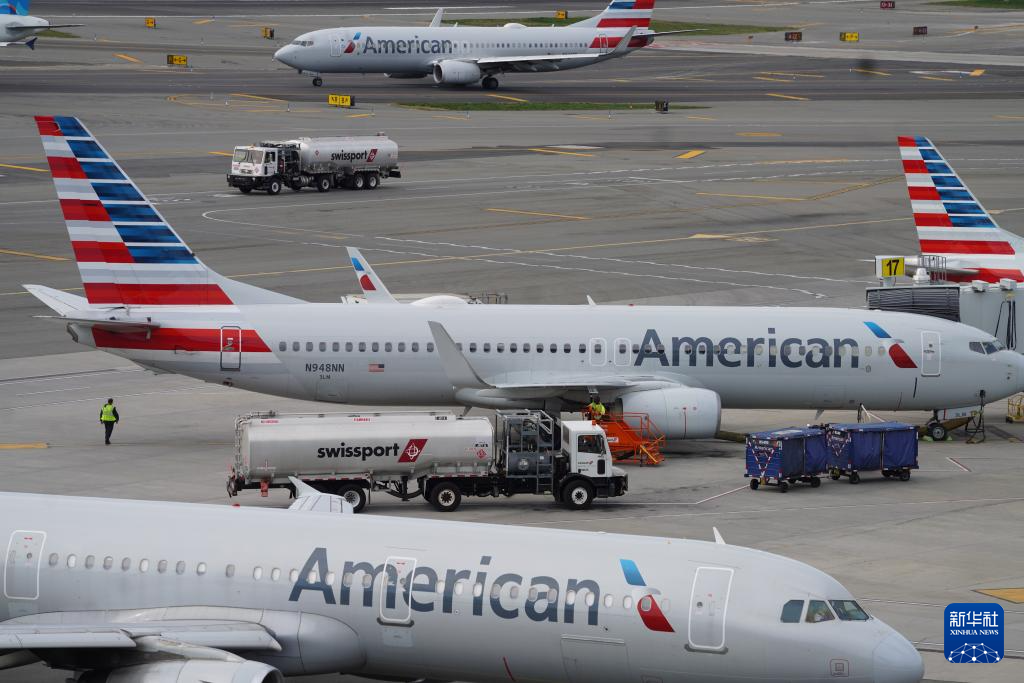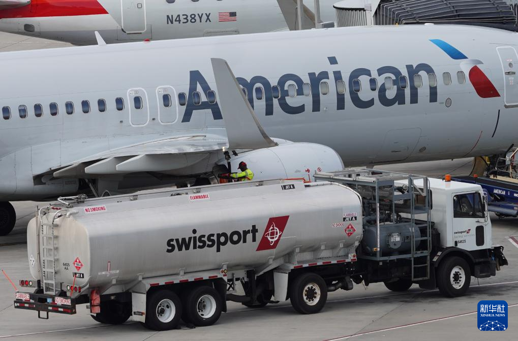4月23日,在美国纽约拉瓜迪亚机场,工作人员为一架美国航空公司飞机加油。