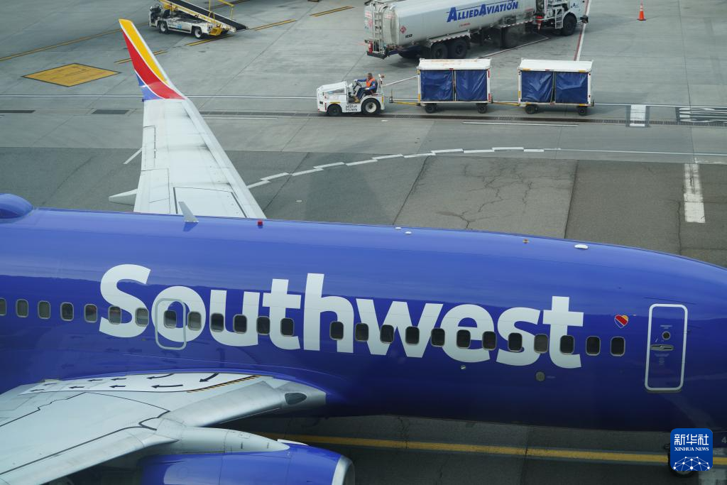 4月23日,在美国纽约拉瓜迪亚机场,加油车停在一架美国西南航空公司飞机旁。