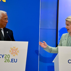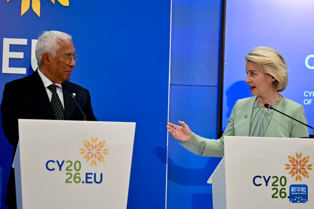 4月24日,在塞浦路斯首都尼科西亚,参加欧盟领导人非正式会议的欧洲理事会主席科斯塔(左)和欧盟委员会主席冯德莱恩会后出席新闻发布会。