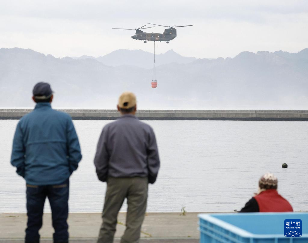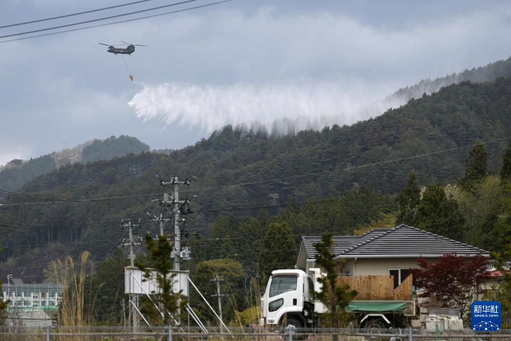 4月28日,直升机在日本岩手县大槌町开展灭火作业。