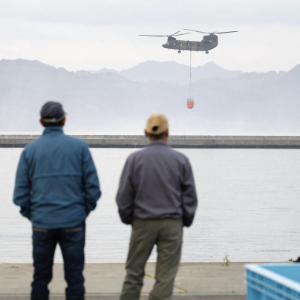 4月28日,在日本岩手县大槌町,当地居民望向用于灭火作业的直升机。