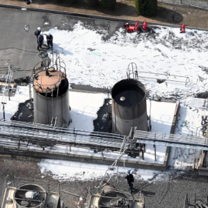 这是4月28日在日本广岛县三次市拍摄的爆炸后的制药厂储罐。