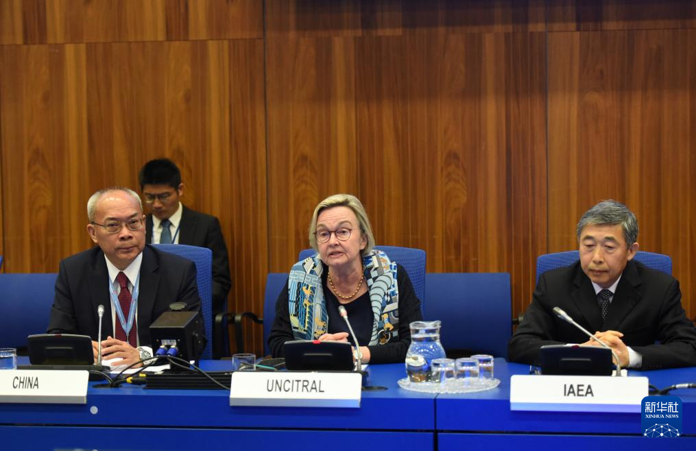4月28日,在奥地利维也纳,联合国国际贸易法委员会秘书长乔宾-布莱特(中)在全球治理倡议主题活动暨维也纳“全球治理之友小组”启动仪式上致辞。