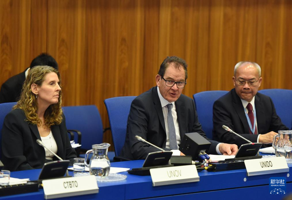 4月28日,在奥地利维也纳,联合国工业发展组织总干事穆勒(中)在全球治理倡议主题活动暨维也纳“全球治理之友小组”启动仪式上致辞。