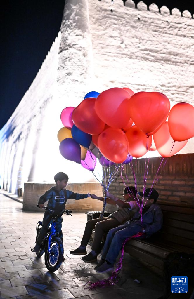 4月26日晚,孩子们在乌兹别克斯坦希瓦古城玩耍。
