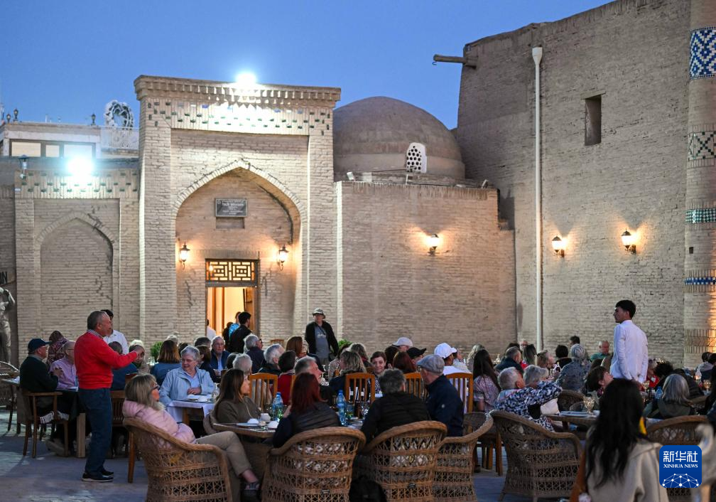 4月26日晚,人们在乌兹别克斯坦希瓦古城的一家餐厅用餐。