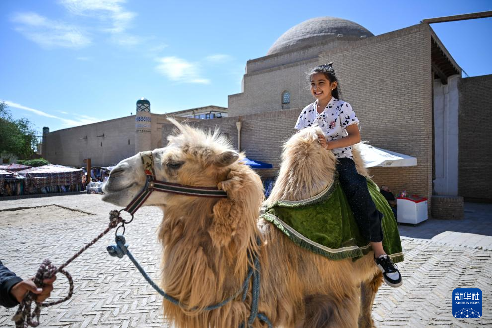 4月26日,一名女孩在乌兹别克斯坦希瓦古城骑骆驼。