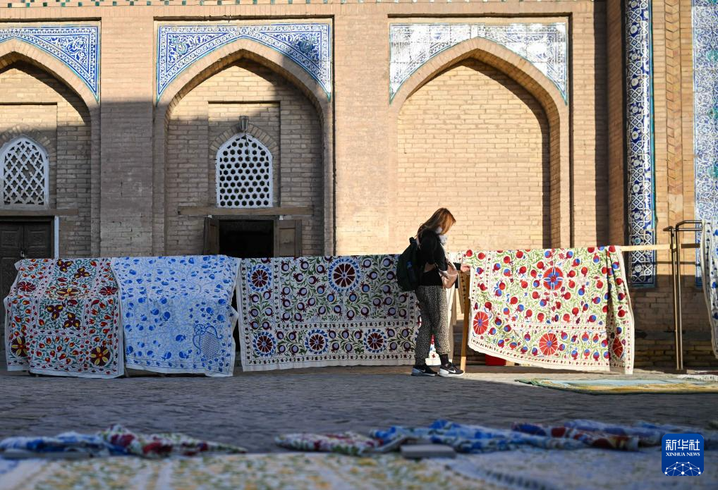 4月26日,游客在乌兹别克斯坦希瓦古城选购纪念品。