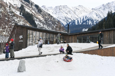 近日,哈萨克斯坦阿拉木图市郊山区被冰雪覆盖,人们纷纷到户外享受冬日雪趣。