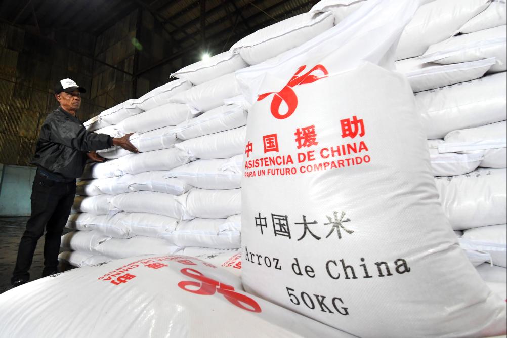 1月19日,在古巴首都哈瓦那,工作人员码放中国援助的大米。