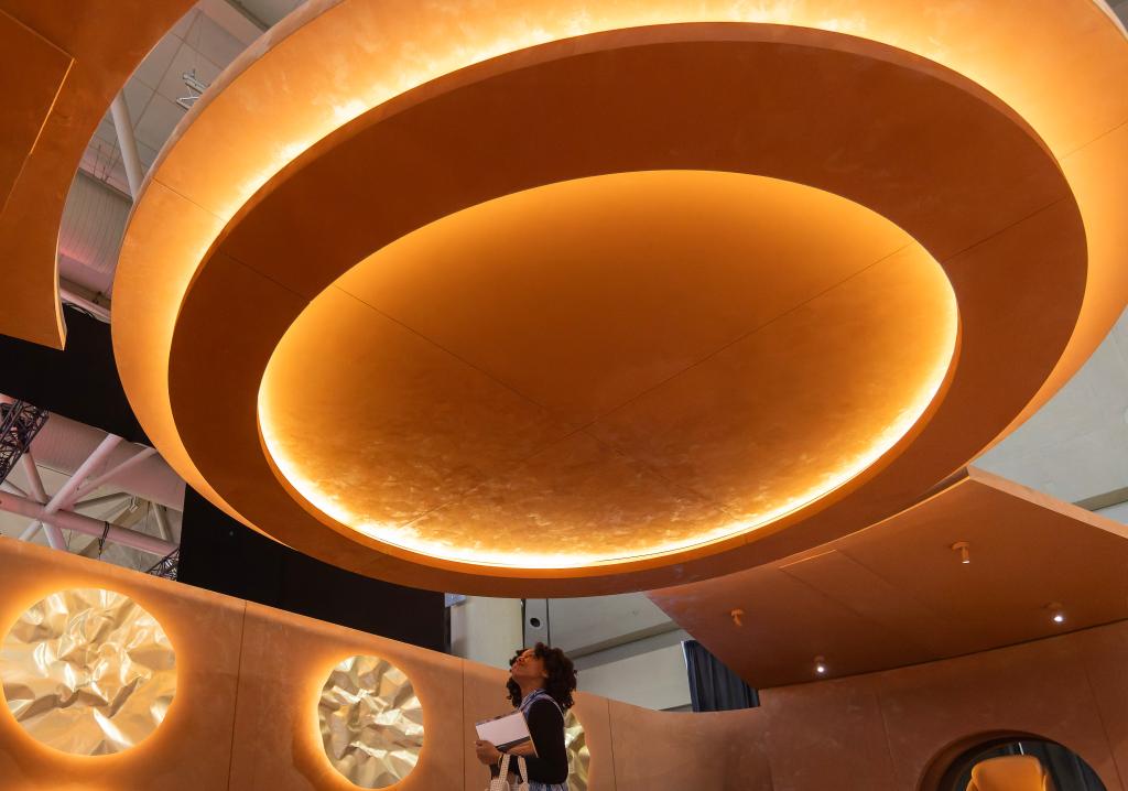 1月22日,一名女子在加拿大多伦多室内设计展上参观一款顶灯。