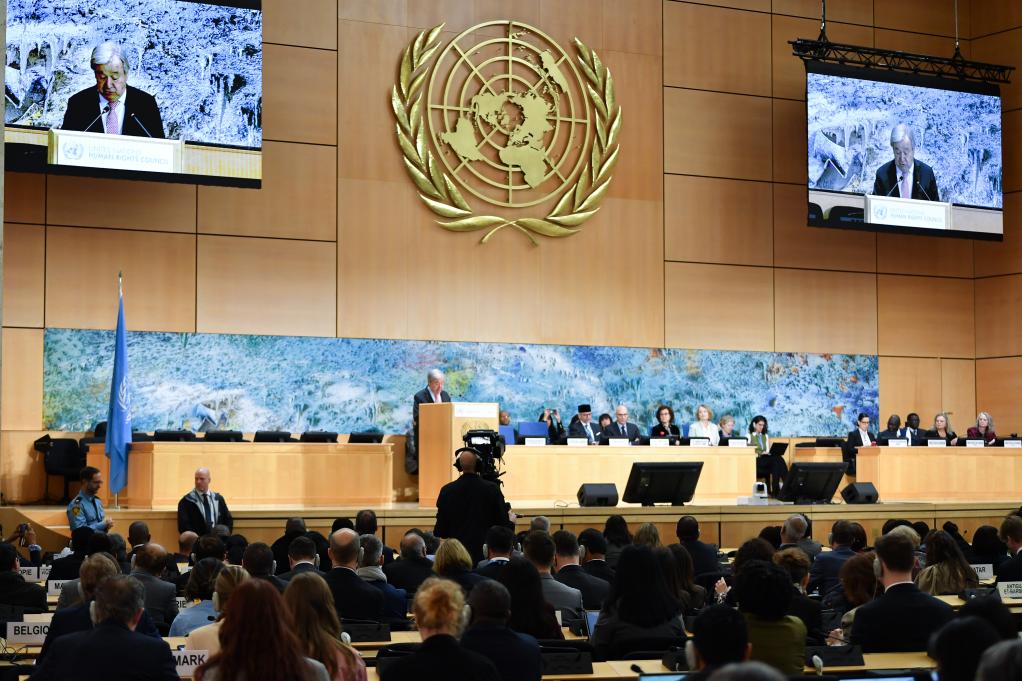 2月23日,在瑞士日内瓦万国宫,联合国秘书长古特雷斯在联合国人权理事会第61届会议上讲话。