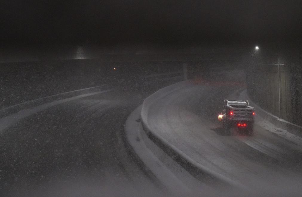 2月22日,在美国纽约,一辆车行驶在积雪的道路上。
