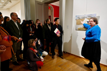 3月25日,在比利时布鲁塞尔,一名比利时艺术家在画展现场介绍自己的画作。