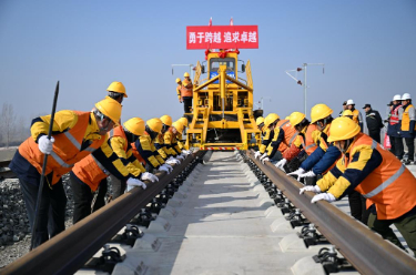 2月1日上午,在河北省保定市顺平县的雄忻高铁建设现场,中铁三局集团施工人员将首对500米长钢轨平稳、精准地铺设在无砟道床上,标志着雄忻高铁正式进入铺轨施工阶段。