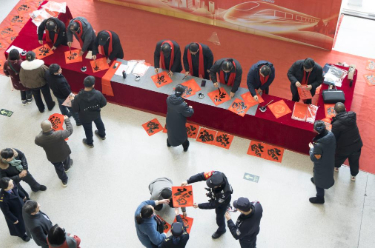 2月1日,江苏海安站开展 “骏马载福至 情暖春运途” 温暖回家路主题活动,邀请海安本地文化志愿者现场挥毫泼墨、书写春联福字。车站工作人员将饱含新春美好祝愿的墨宝送到旅客手中,让浓浓墨香浸润旅途,用暖心服务为归乡游子送上新春祝福。