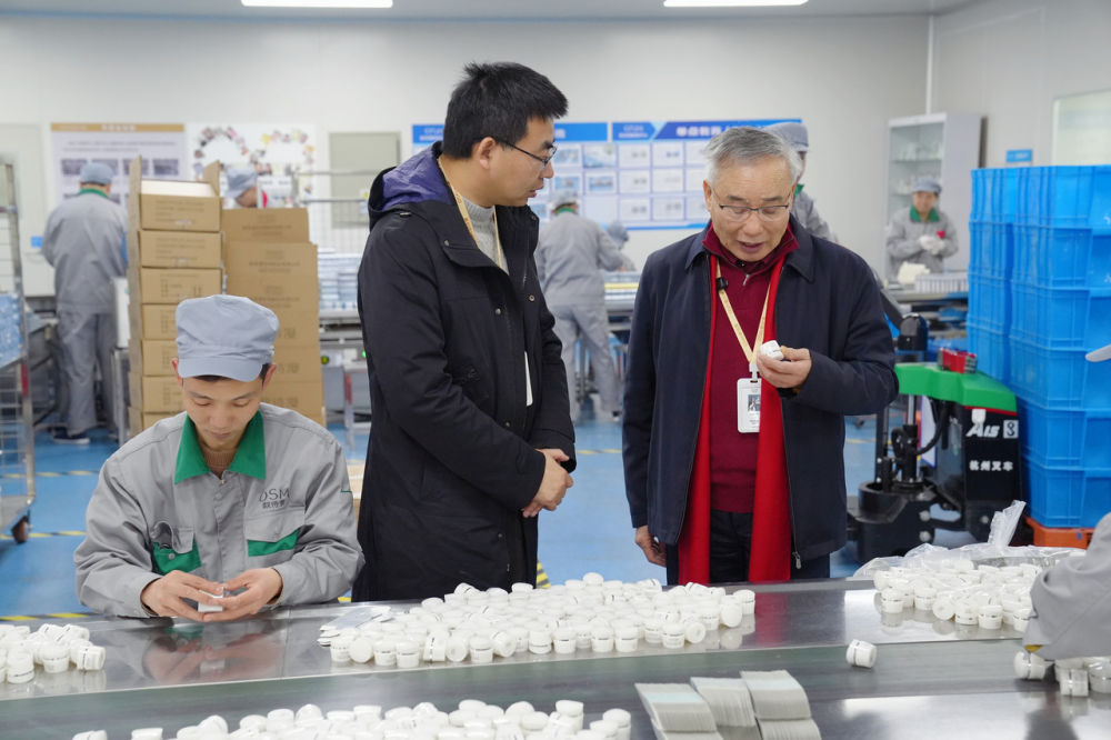 沈志荣(右一)在生产车间检查产品质量。受访者供图