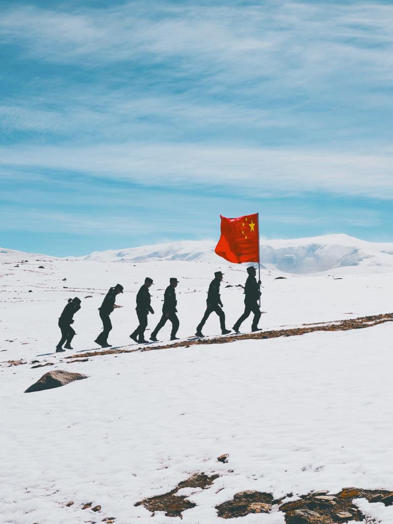 海拔5600米,在岗布冰川的注视下,鲜红的五星红旗和移动的藏蓝身影,成为天地间最醒目的色彩。他们攀上冰碛垄,踏查边境情况,不放过任何一丝异常。