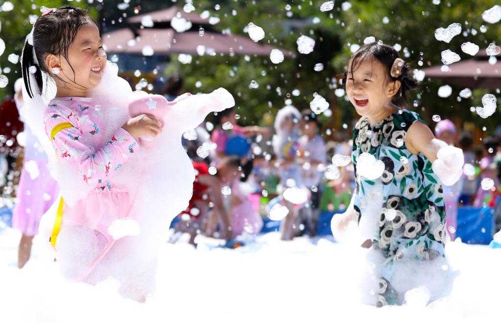 2024年5月31日,贵州省印江土家族苗族自治县第二幼儿园的孩子们在泡泡派对上玩耍戏水。新华社发(王东 摄)