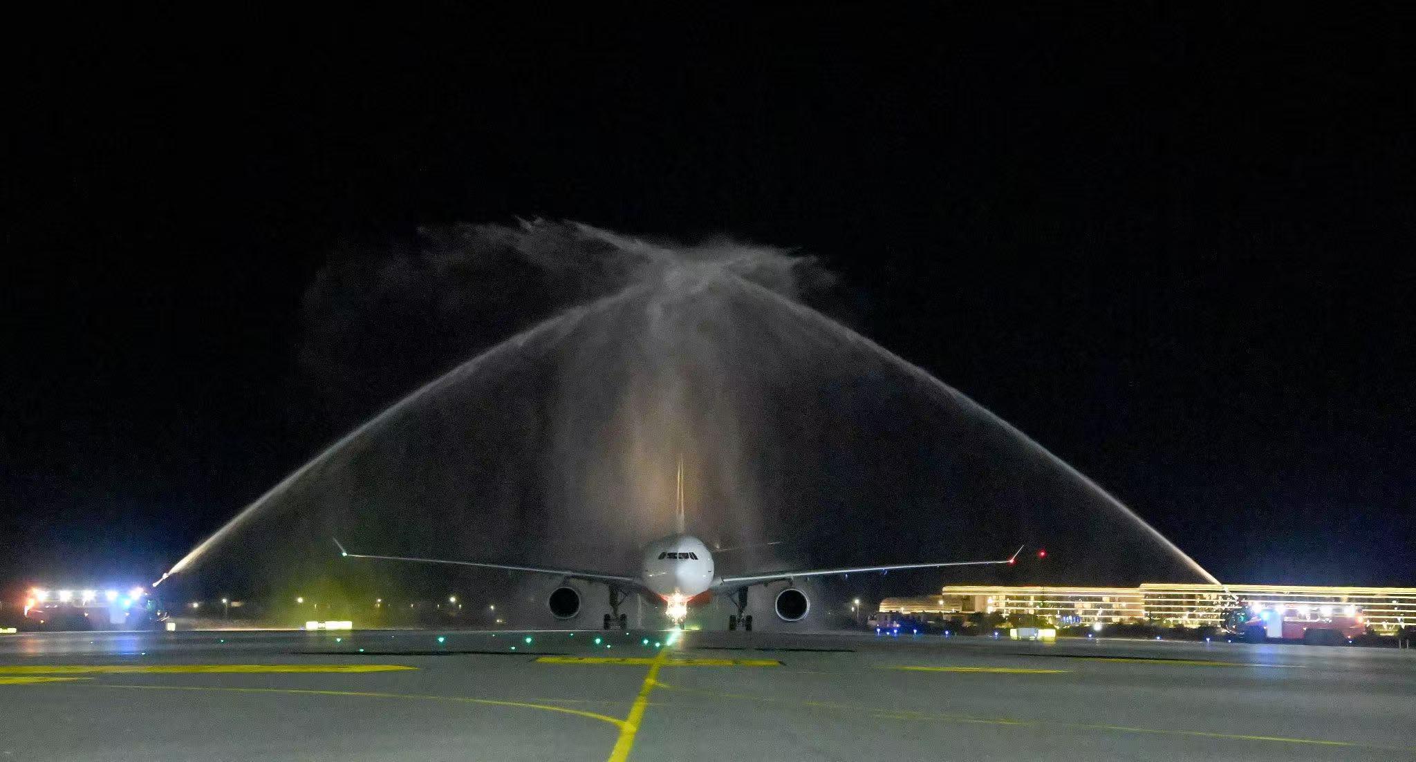 当地时间11月30日19时21分,随着中国东方航空MU2051航班降落在阿曼马斯喀特国际机场,首条由中国航空公司运营的中阿直飞航线顺利完成首航。马斯喀特国际机场当天为来自北京大兴国际机场的首航航班举行了隆重的“过水门”仪式。