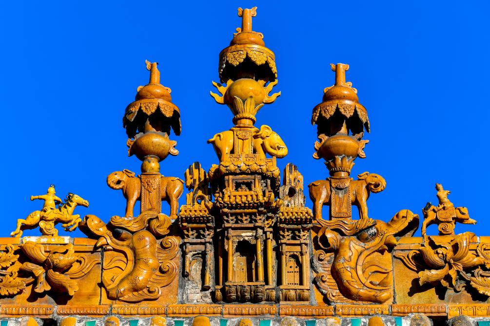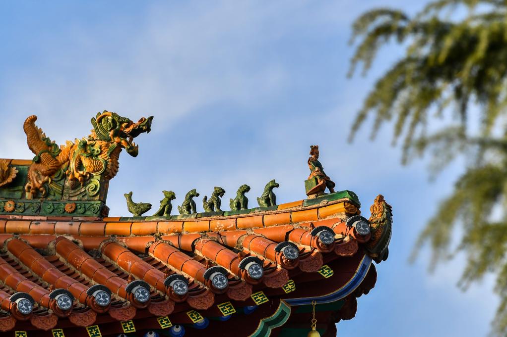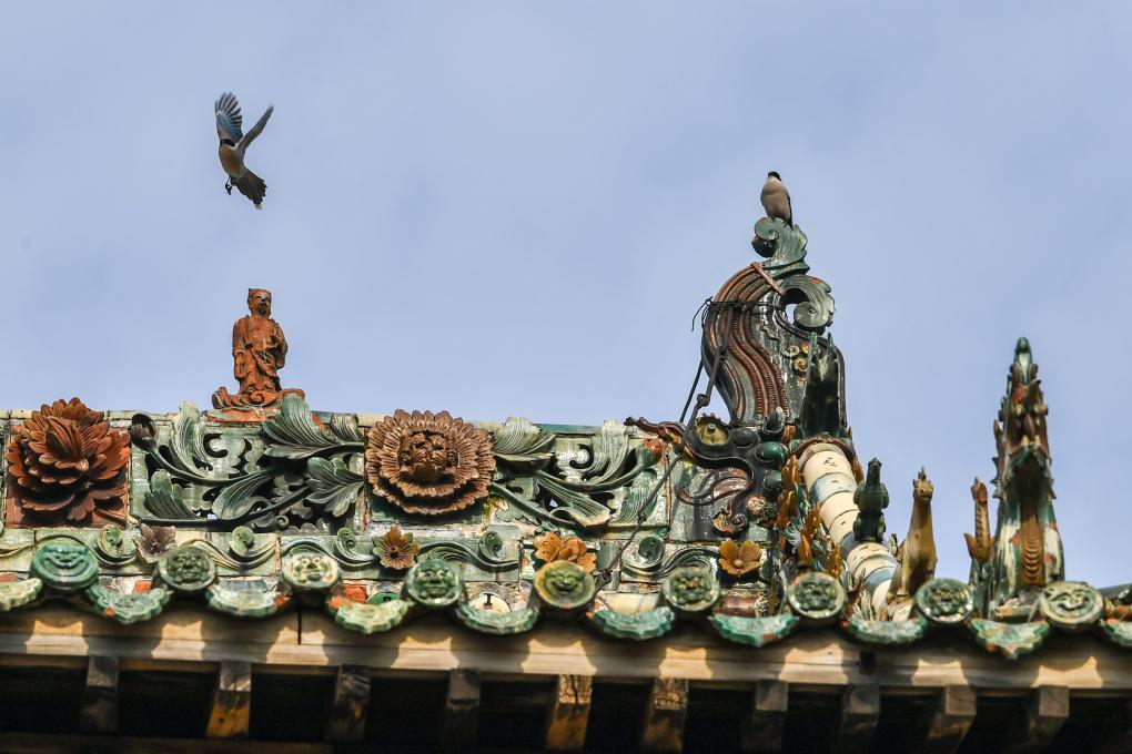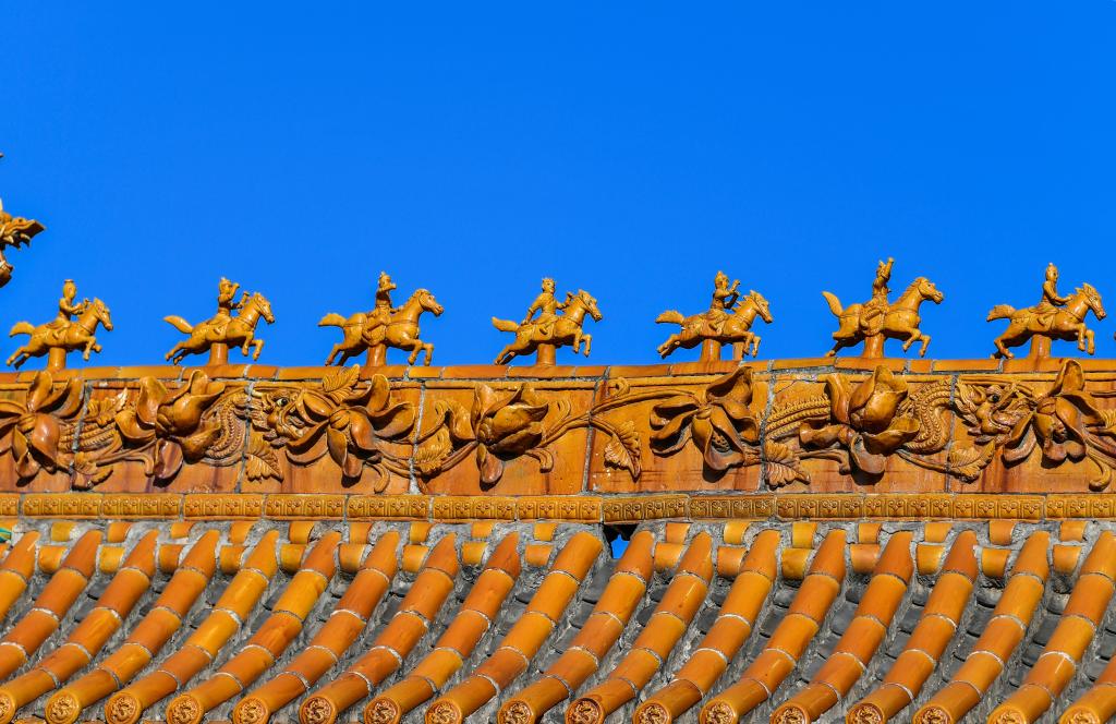 这是11月14日在山西省运城市解州关帝庙拍摄的古建顶上的装饰构件。