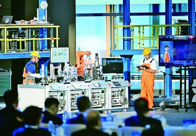 在河北邯郸举行的河北省第二届职业技能大赛上,参观者在展演区参观。新华社发