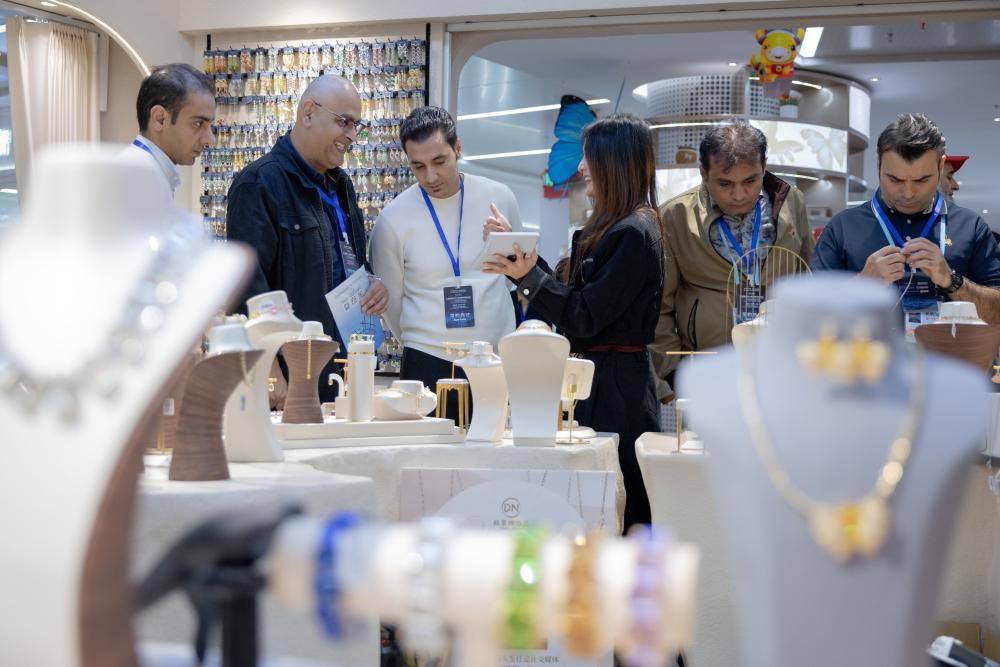 2025年10月27日,外国商人在浙江义乌第六代市场全球数贸中心进行采购洽谈。(吴峰宇 摄)
