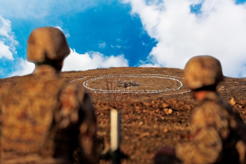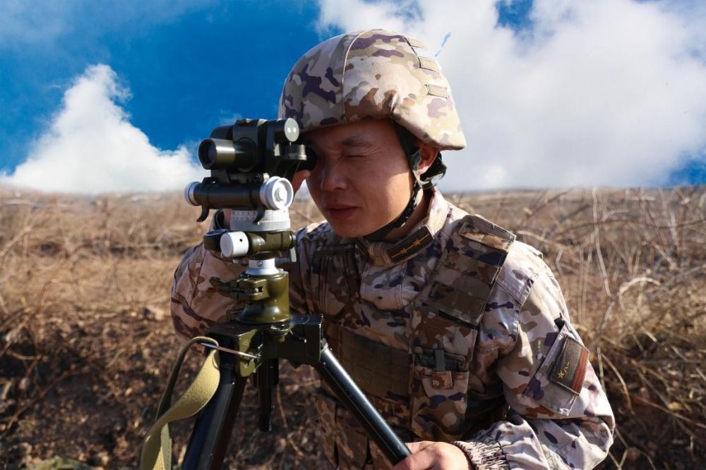 ↑迫击炮班进行放列观察射击。冯圣 摄