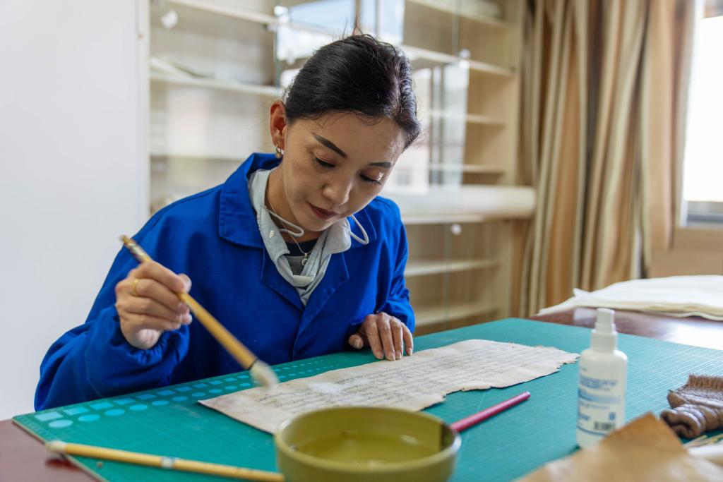 2025年8月13日,西藏自治区古籍保护中心古籍修复员次仁央宗在对古籍进行除霉。新华社记者 旦增尼玛曲珠 摄