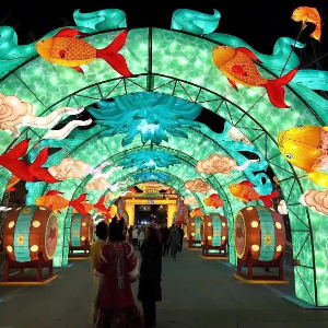 氛围主题分为两大篇章,第一个以莫高窟的壁画和敦煌元素组成的“纹话敦煌”。第二部分由天街灯市组成“十二辰彩”,将敦煌传统的壁画用声光电技术呈现出来。增加游戏互动环节、设置NPC等让游客能够沉浸式体验灯会。