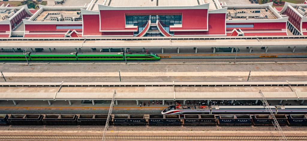 “复兴号”(上)、“澜沧号”动车组列车停靠在中老铁路磨憨站。(无人机照片,新华社记者 胡超 摄)