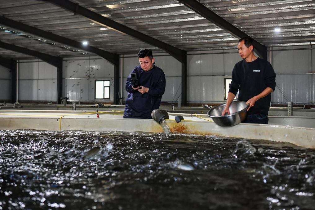 成宇蛟(左)在山西省柳林县留誉镇杜家庄村拍摄养鱼场工人喂鱼。