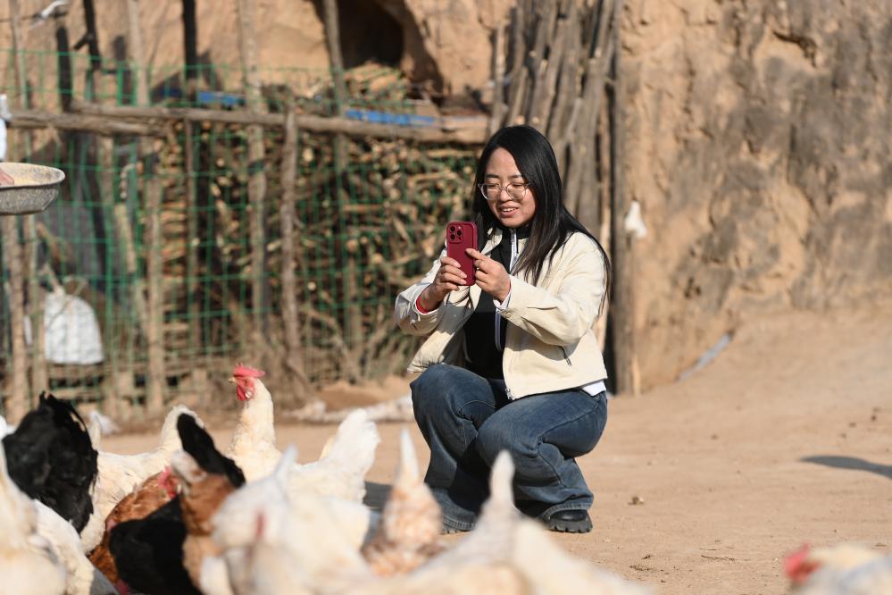 高小聪(左)在山西省吕梁市临县雷家碛乡双井沟村拍摄村民养鸡的视频。