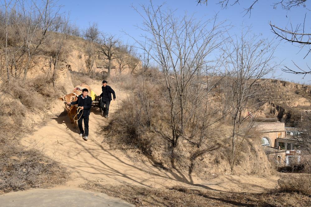 高小聪(前)在山西省吕梁市临县雷家碛乡白家庄村牵着黄牛运送从农户家采购的粮食。