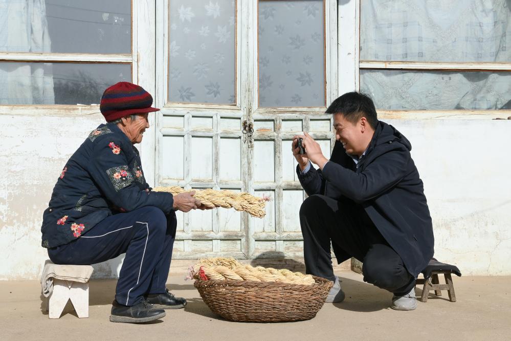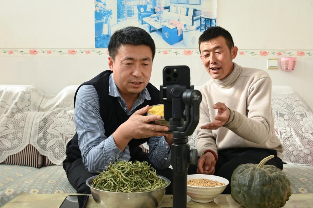 高小聪(右)在山西省吕梁市临县雷家碛乡双井沟村为村民拍摄介绍土特产的视频。
