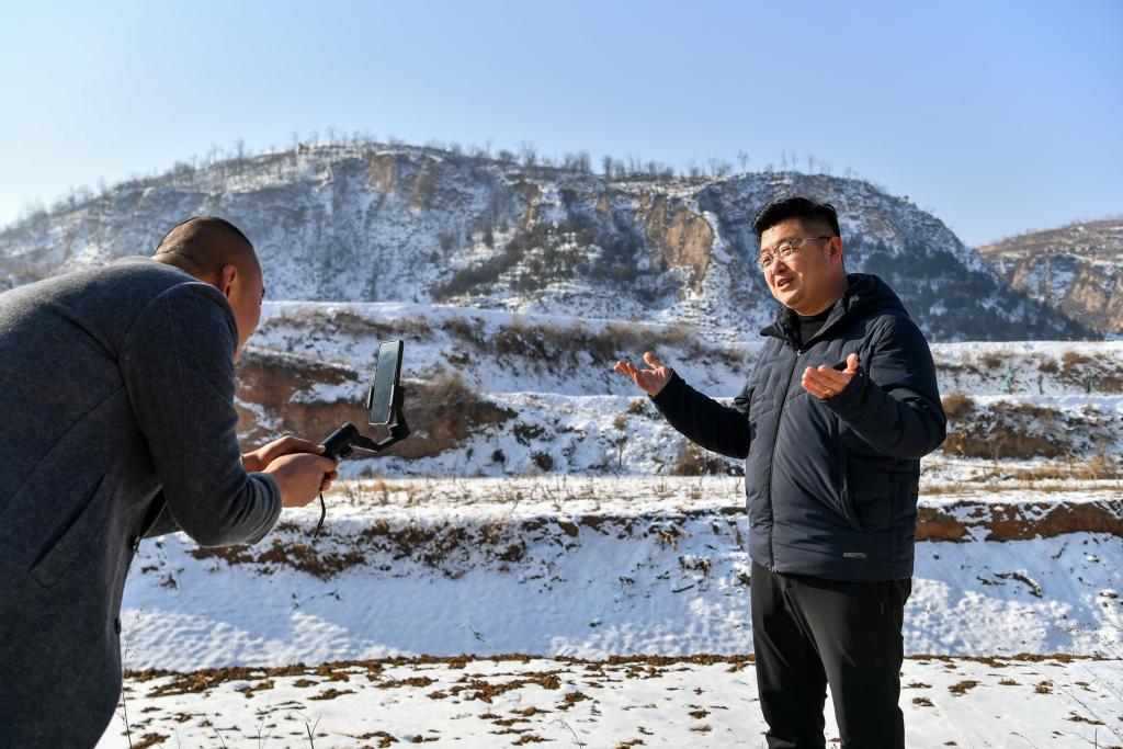 成宇蛟(右)在山西省柳林县留誉镇杜家庄村录制介绍家乡的短片。