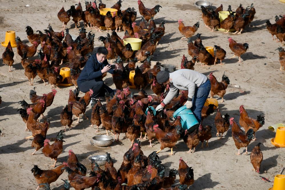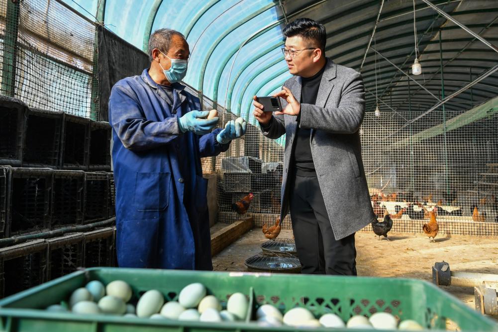 成宇蛟(右)在山西省柳林县留誉镇杜家庄村的养鸡场拍摄短片。