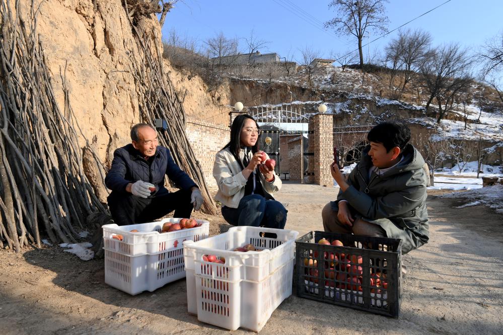 冉雪梅(中)和同事在山西省石楼县裴沟乡裴沟村帮村民苏长勤(左)拍摄推销苹果的视频。