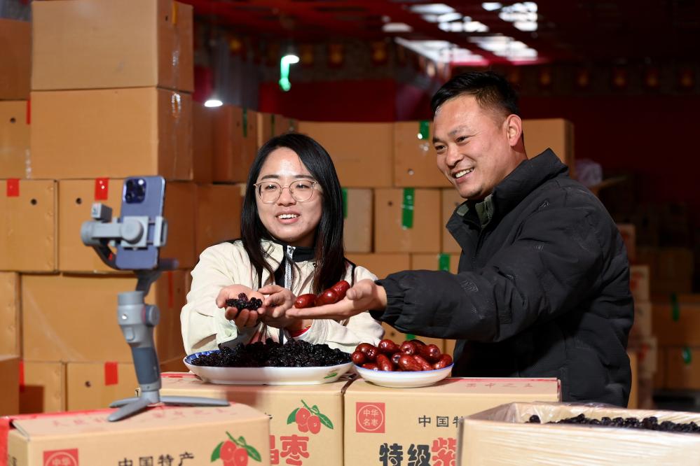 冉雪梅(左)在山西省石楼县裴沟乡的山西优品食代电子商务有限公司通过直播推销红枣。