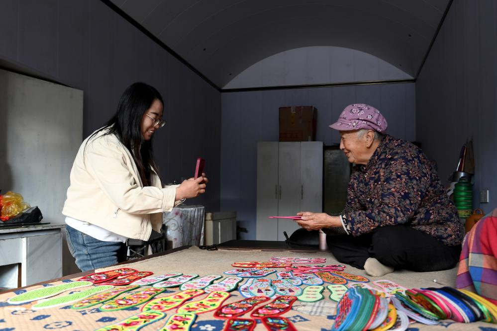冉雪梅(左)在山西省吕梁市石楼县裴沟乡裴沟村拍摄村民冉计花制作的鞋垫。