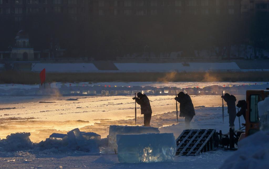 1月17日,在松花江哈尔滨段江面,工人在进行采冰作业。新华社发(张树 摄)